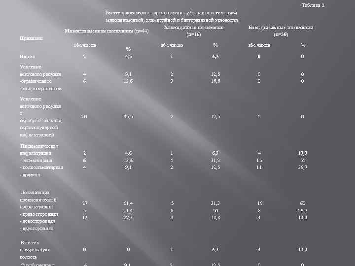 Таблица 2 Признаки Рентгенологическая картина легких у больных пневмонией микоплазменной, хламидийной и бактериальной этиологии Хламидийная пневмония Микоплазменная пневмония (n=44) (n=16) абс. число Бактериальные пневмонии (n=30) абс. число % 1 6, 3 0 0 Норма 2 % 4, 5 Усиление легочного рисунка -ограниченное -распространенное 4 6 9, 1 13, 6 2 3 12, 5 18, 8 0 0 Усиление легочного рисунка с перибронхиальной, периваскулярной инфильтрацией 20 45, 5 2 12, 5 0 0 Пневмоническая инфильтрация: - сегментарная - полисегментарная - долевая 2 6 4 4, 6 13, 6 9, 1 1 5 2 6, 3 31, 2 12, 5 4 15 11 13, 3 50 36, 7 Локализация пневмонической инфильтрации: - правосторонняя - левосторонняя - двусторонняя 27 5 12 61, 4 11, 4 27, 3 5 8 3 31, 3 50 18, 8 18 8 4 60 26, 7 13, 3 Выпот в плевральную полость 0 0 1 6, 3 4 13, 3