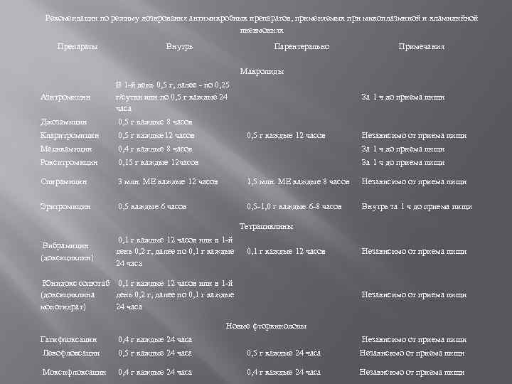 Рекомендации по режиму дозирования антимикробных препаратов, применяемых при микоплазмнной и хламидийной пневмониях Препараты Внутрь Парентерально Примечания Макролиды Азитромицин В 1 -й день 0, 5 г, далее - по 0, 25 г/сутки или по 0, 5 г каждые 24 часа За 1 ч до приема пищи Джозамицин 0, 5 г каждые 8 часов Кларитромицин 0, 5 г каждые 12 часов Независимо от приема пищи Медикамицин 0, 4 г каждые 8 часов За 1 ч до приема пищи Рокситромицин 0, 15 г каждые 12 часов За 1 ч до приема пищи Спирамицин 3 млн. МЕ каждые 12 часов 1, 5 млн. МЕ каждые 8 часов Независимо от приема пищи Эритромицин 0, 5 каждые 6 часов 0, 5 -1, 0 г каждые 6 -8 часов Внутрь за 1 ч до приема пищи Тетрациклины Вибрамицин (доксициклин) 0, 1 г каждые 12 часов или в 1 -й день 0, 2 г, далее по 0, 1 г каждые 12 часов 24 часа Юнидокс солютаб 0, 1 г каждые 12 часов или в 1 -й (доксициклина день 0, 2 г, далее по 0, 1 г каждые моногидрат) 24 часа Независимо от приема пищи Новые фторхинолоны Гатифлоксацин 0, 4 г каждые 24 часа Независимо от приема пищи Левофлоксацин 0, 5 г каждые 24 часа Независимо от приема пищи Моксифлоксацин 0, 4 г каждые 24 часа Независимо от приема пищи