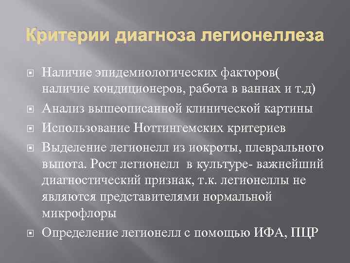 Критерии диагноза легионеллеза Наличие эпидемиологических факторов( наличие кондиционеров, работа в ваннах и т. д) Анализ вышеописанной клинической картины Использование Ноттингемских критериев Выделение легионелл из иокроты, плеврального выпота. Рост легионелл в культуре- важнейший диагностический признак, т. к. легионеллы не являются представителями нормальной микрофлоры Определение легионелл с помощью ИФА, ПЦР