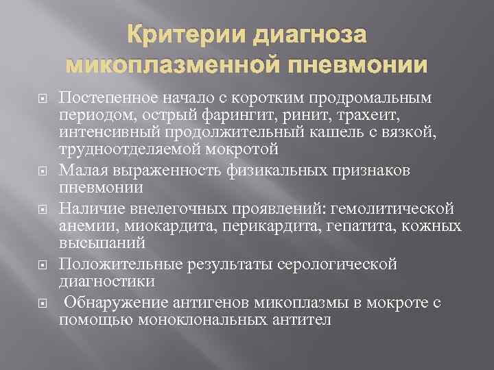Критерии диагноза микоплазменной пневмонии Постепенное начало с коротким продромальным периодом, острый фарингит, ринит, трахеит, интенсивный продолжительный кашель с вязкой, трудноотделяемой мокротой Малая выраженность физикальных признаков пневмонии Наличие внелегочных проявлений: гемолитической анемии, миокардита, перикардита, гепатита, кожных высыпаний Положительные результаты серологической диагностики Обнаружение антигенов микоплазмы в мокроте с помощью моноклональных антител