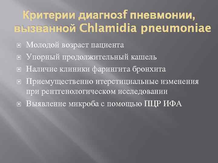 Критерии диагнозf пневмонии, вызванной Chlamidia pneumoniae Молодой возраст пациента Упорный продолжительный кашель Наличие клиники фарингита бронхита Приемущественно итерстициальные изменения при рентгенологическом исследовании Выявление микроба с помощью ПЦР ИФА