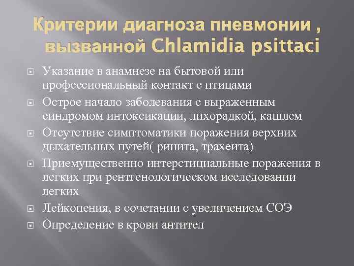 Критерии диагноза пневмонии , вызванной Chlamidia psittaci Указание в анамнезе на бытовой или профессиональный контакт с птицами Острое начало заболевания с выраженным синдромом интоксикации, лихорадкой, кашлем Отсутствие симптоматики поражения верхних дыхательных путей( ринита, трахеита) Приемущественно интерстициальные поражения в легких при рентгенологическом исследовании легких Лейкопения, в сочетании с увеличением СОЭ Определение в крови антител
