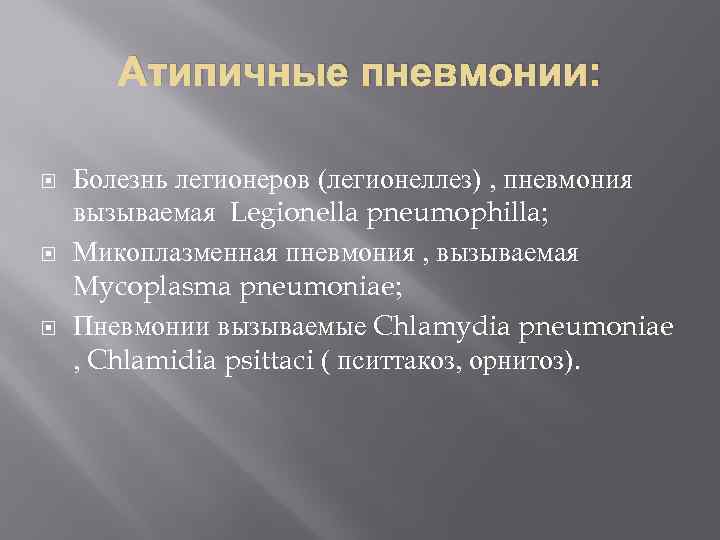 Атипичные пневмонии: Болезнь легионеров (легионеллез) , пневмония вызываемая Legionella pneumophilla; Микоплазменная пневмония , вызываемая Mycoplasma pneumoniae; Пневмонии вызываемые Chlamydia pneumoniae , Chlamidia psittaci ( пситтакоз, орнитоз).