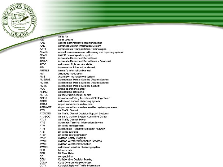 Automatic Dependent Surveillance Broadcast (ADS-B) • A technology designed to address both airspace and ground-based movement needs. • Collaborative decision making is possible through ADSB surveillance information available to both ATC and aircrews. • ADS-B combined with predictable, repeatable flight paths allow for increased airspace efficiencies in high density terminal areas or when weather conditions preclude visual operations. • Additionally, ADS-B allow for enhanced ground movement management (aircraft and vehicles) and improved airside safety