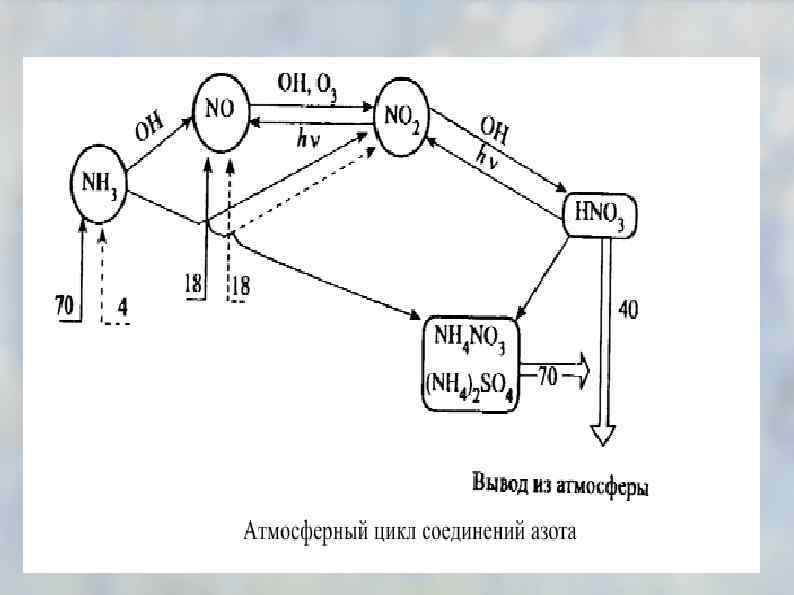 Смог NO 2 + hν → O + NO, O + O 2 + M → O 3 + M, М - третье вещество, принимающее избыток энергии. вий на основе соединений азота в тропосфере дополняет O 3 + NO → O 2 + NO 2 OH* + CH 4 → H 2 O + CH 3 O 2, CH 3 O 2 + NO → CH 3 O + NO 2, CH 3 O + O 2 → HCHO + HO 2 + NO → NO 2 + OH* 4 NO 2 + 2 H 2 O + O 2 → 4 HNO 3 + R–CH=CH–R → RCHO + RO* + HCO*, CO* - свободные радикалы. ПАН