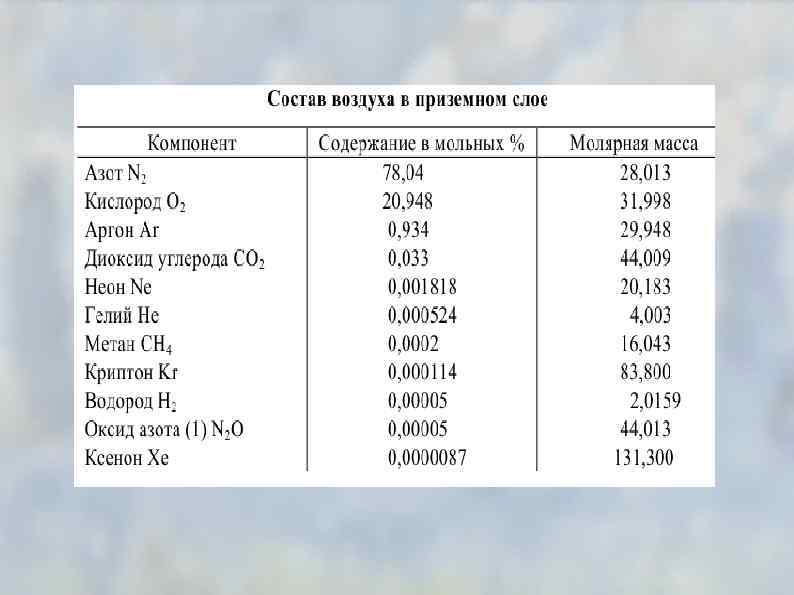Состав воздуха на разной высоте от земной поверхности Высота, Кислоро Азот. % Аргон, % Гелий. % Водород, Давление км д, % % (мм. рт. ст. ) 0 20, 94 78, 09 0, 93 0, 01 760 5 20, 94 77, 89 0, 94 0, 01 405 10 20, 99 78, 02 0, 94 0, 01 168