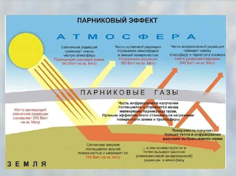 Парниковый эффект — глобальное потепление Основные парниковые газы атмосферы Земли: Водяной пар H 2 O 36 – 72 % Диоксид углерода CO 2 9 – 26 % Метан CH 4 4 – 9 % Озон O 3 3 – 7 % Гипотеза о метангидратном ружье — серия гипотез о том, что растущий уровень температур океана (и/или падение уровня океана) может запустить внезапное высвобождение метана из отложений гидратов метана под морским дном, что в свою очередь приведёт к дальнейшему росту температур и дальнейшей дестабилизации гидратов метана — в результате запуская самоусиливающийся процесс.