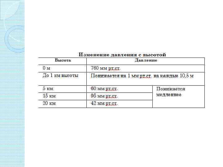 Нормальное атмосферное давление – вес атмосферного столба сечением 1 см 2 на уровне океана при 00 С на 450 широты, оно уравновешивается столбиком ртути в 760 мм. Нормальное атмосферное давление равно 760 мм ртутного столба или 1013, 25 мб или 1013, 25 г. Па