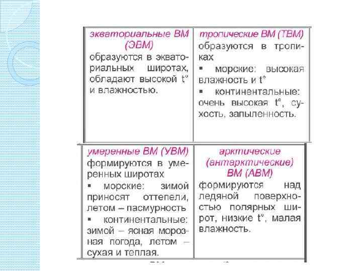 Воздушные массы — большие объемы воздуха тропосфе ры, обладающие более или менее одинаковыми свойствами (температура, влажность, запыленность и т. п. ). Свойства воздушных масс определяются территорией или акватори ей, над которой они формируются.