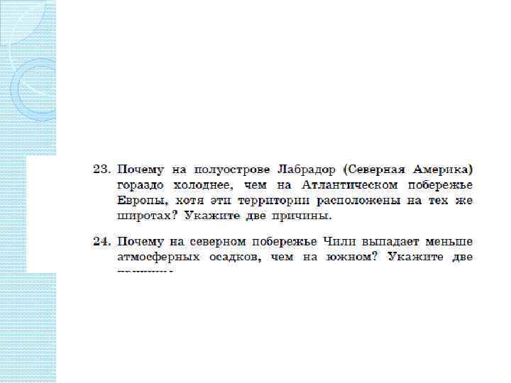 Климат — характерный для данной местности много летний режим погоды. Климатообразующие факторы: Ø географическая широта места; Ø циркуляция атмосферы ; Ø океанические течения; Ø абсолютная высота места; Ø удаленность от океана Ø рельеф