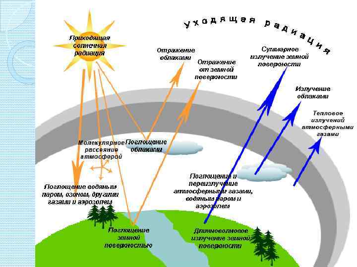 Дополнительно: Суммарная солнечная радиация, поступившая на земную поверхность, частично отражается обратно. Отношение отраженной радиации к суммарной, выраженное в процентах, называется альбедо. Альбедо характеризует отражательную способность поверхности и зависит от ее цвета, влажности и других свойств. Наибольшей отражательной способностью обладает свежевыпавший снег – до 90%. Альбедо Земли как планеты принимают равным 35%.