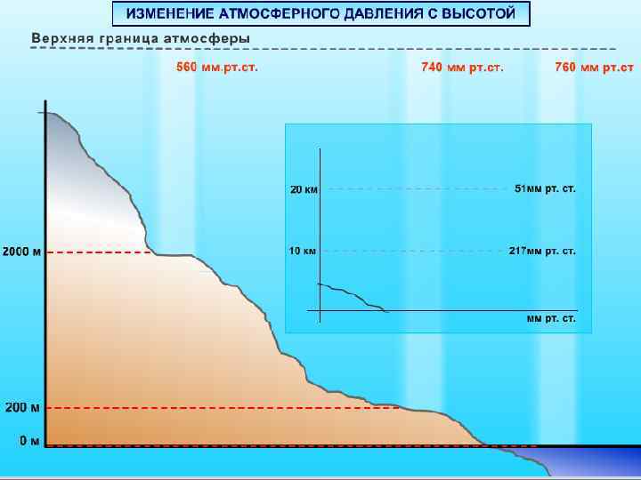 На 100 м подъема давление падает на 10 мм рт. ст. • С высоты 2000 м на 150 м подъема -10 мм рт. ст. ; • 6000 м на 200 м подъема – 10 мм. рт. ст. • На высоте 10000 м атмосферное давление 217 мм рт. ст. • На высоте 20000 м 51 мм рт. ст.