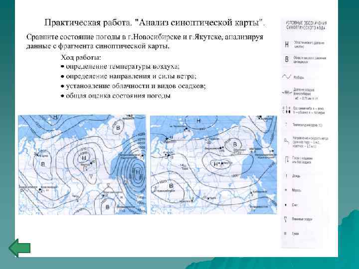 Синоптическая карта Содержит сведения о погоде большой территории. u u u На ней показано: давление воздуха, атмосферные фронты, области высокого и низкого давления и направление их движения, области с осадками и характер осадков, скорость и направление ветра, температура воздуха.
