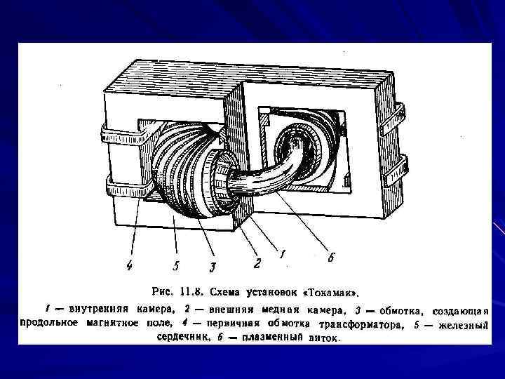 Магнитное удержание плазмы Наибольшие успехи данного направления связаны с установками типа "Токамак". Первая установка с замкнутой тороидальной камерой для разогрева и магнитного удержания плазмы была построена в 1955 году в ИАЭ им. И. В. Курчатова в отделе, которым руководил Л. А. Арцимович. Такие установки получили название "Токамак" (по первым слогам названий основных элементов конструкции установки: тороидальная камера, магнитные катушки).