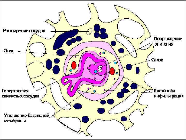В третьей стадии патогенеза БА образуется очаг воспалительный инфильтрация в слизистой или подслизистом слое стенки бронхиол. В очаги воспаления мигрируют клеточные элементы (эозинофилы, лимфоциты и т. д. ) при непосредственном участии хемотаксических факторов. Воспалительные инфильтраты сами по себе нарушают проходимость бронхов – бронхиальная обструкция.
