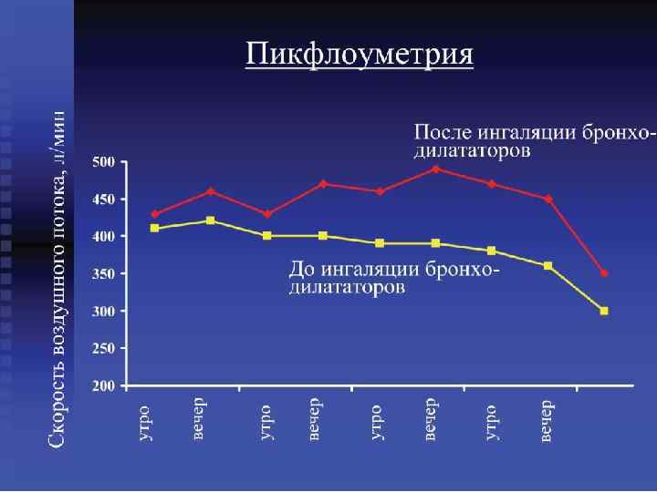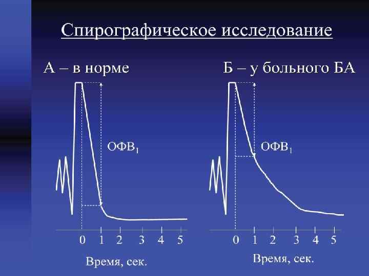 Диагностика 1)Обьективные методы исследования (общий осмотр, аускультация - признаки бронхиальной обструкции: : дыхание с удлиненным выдохом, сухие свистящие хрипы) 2) общий анализ крови – эозинофилия 3) исследование мокроты – слепки мелких бронхов (спиралей Куршмана), эозинофилы, кристаллы Шарко. Лейдена (некротизированные нейтрофилы, ранее инфильтрировавшие стенку бронха), спиралей Куршмана. 4) исследование уровней Ig. E в крови – повышен 5) Исследование функции внешнего дыхания : - спирометрия (ОФВ) - пикфлоуметрия (ПСВ) 6) Аллергические пробы 7) Провокационные пробы с М - холиностимулятором