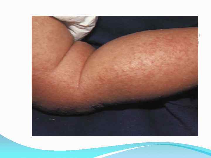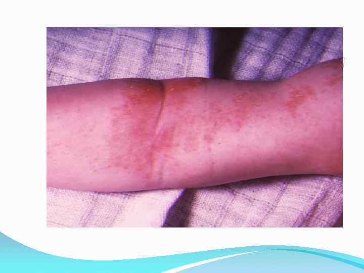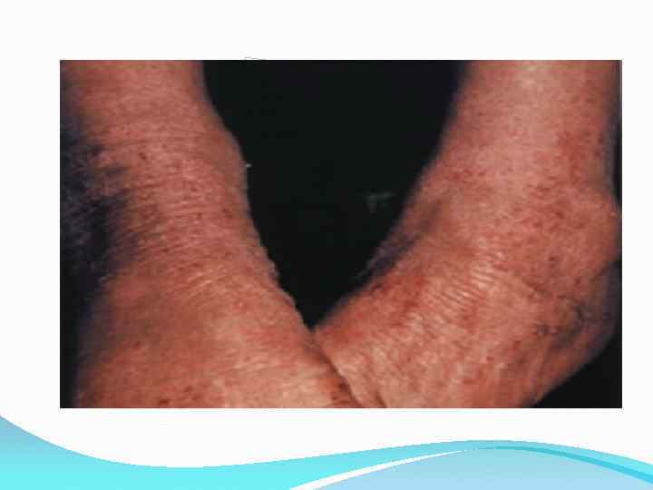 Симптомы хронического атопического дерматита • Утолщение кожи и усиление кожного рисунка. • Болезненные трещины на коже, особенно на ладонях и подошвах. • Гиперпигментация век (более темный цвет кожи на веках). • • • Симптом «зимней стопы» - гиперемия и умеренная инфильтрация подошв, шелушение, трещины. Симптом Моргана (Денье-Моргана, складки Денье-Моргана) – углубленные морщинки на нижних веках у детей. Симптом «полированных ногтей» - исчезновение продольной исчерченности и характерный вид ногтя, вследствие постоянного расчеса кожи. Симптом «меховой шапки» - дистрофия волос затылочной области. Симптом псевдо Хертога – временное исчезновение волос, сначала в наружной трети, а затем и на других участках бровей у некоторых больных