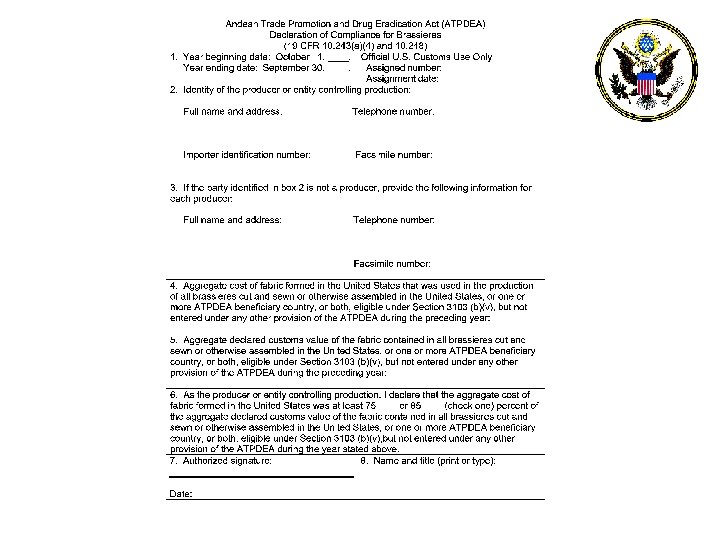 Declaration of Compliance 1. 2. 3. 4. , 5. 6. 7. Year Commencing October 1, Ending September 30 of Calendar Year in Which Applicable % Standard was Met Legal Name and Address of the Preparer, Including Preparer’s I. R. Number, if Applicable Legal Name(s) and Address(es) of ATPDEA Producer, if not Already Identified in Block 2 Related to Goods Entered During Year in Block 1 Declare Standard: 75% or 85% Signature of Authorized, Knowledgeable Person