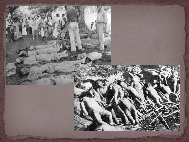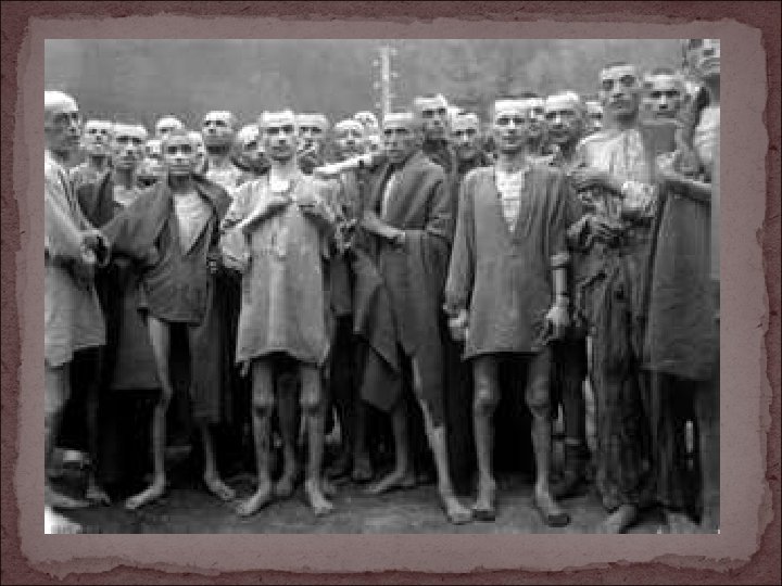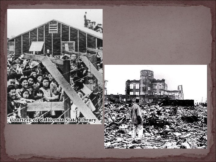 Other Atrocities of WWII Atomic Bombs Dropped on Hiroshima and Nagasaki by U. S. Destroyed 2 mile radius, fire beyond center, radiation Up to 275, 000 deaths, many injuries, birth defects Japanese Internment U. S. citizens of Japanese (110, 000) decent sent to camps Property confiscated or forced to be sold Accused of spying (men, women, children, babies) Poor camp conditions (food, housing, heat) “Americanized” while in camps