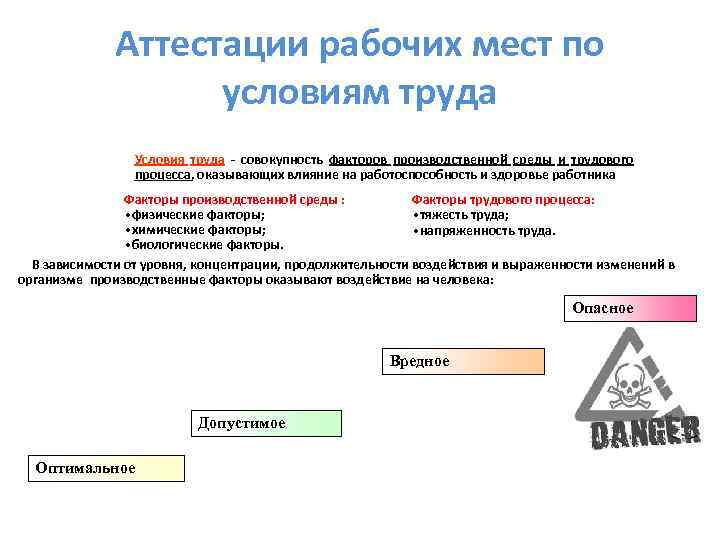 Аттестации рабочих мест по условиям труда Условия труда - совокупность факторов производственной среды и трудового процесса, оказывающих влияние на работоспособность и здоровье работника Факторы производственной среды : Факторы трудового процесса: • физические факторы; • тяжесть труда; • химические факторы; • напряженность труда. • биологические факторы. В зависимости от уровня, концентрации, продолжительности воздействия и выраженности изменений в организме производственные факторы оказывают воздействие на человека: Опасное Вредное Допустимое Оптимальное