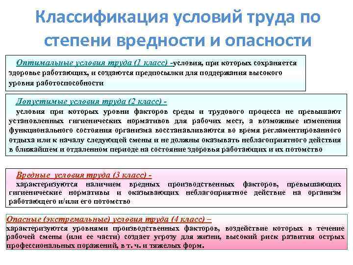 Классификация условий труда по степени вредности и опасности Оптимальные условия труда (1 класс) -условия, при которых сохраняется здоровье работающих, и создаются предпосылки для поддержания высокого уровня работоспособности Допустимые условия труда (2 класс) условия при которых уровни факторов среды и трудового процесса не превышают установленных гигиенических нормативов для рабочих мест, а возможные изменения функционального состояния организма восстанавливаются во время регламентированного отдыха или к началу следующей смены и не должны оказывать неблагоприятного действия в ближайшем и отдаленном периоде на состояние здоровья работающих и их потомство Вредные условия труда (3 класс) - характеризуются наличием вредных производственных факторов, превышающих гигиенические нормативы и оказывающих неблагоприятное действие на организм работающего и/или его потомство Опасные (экстремальные) условия труда (4 класс) – характеризуются уровнями производственных факторов, воздействие которых в течение рабочей смены (или ее части) создает угрозу для жизни, высокий риск развития острых профессиональных поражений, в т. ч. и тяжелых форм.