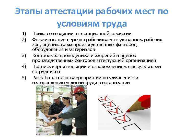 Этапы аттестации рабочих мест по условиям труда 1) 2) 3) 4) 5) Приказ о создании аттестационной комиссии Формирование перечня рабочих мест с указанием рабочих зон, оцениваемых производственных факторов, оборудования и материалов Контроль за проведением измерений и оценок производственных факторов аттестующей организацией Подпись карт аттестации и ознакомлением с результатами сотрудников Разработка плана мероприятий по улучшению и оздоровлению условий труда в организации