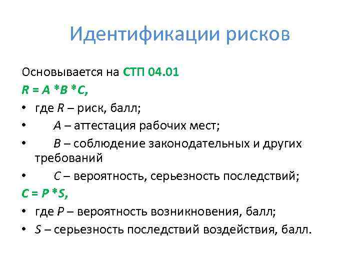 Идентификации рисков Основывается на СТП 04. 01 R = А *В *С, • где R – риск, балл; • А – аттестация рабочих мест; • В – соблюдение законодательных и других требований • С – вероятность, серьезность последствий; С = P *S, • где P – вероятность возникновения, балл; • S – серьезность последствий воздействия, балл.