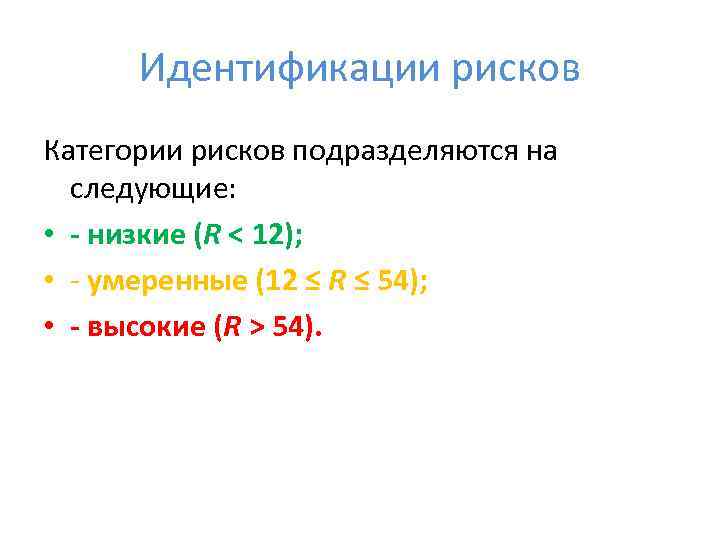 Идентификации рисков Категории рисков подразделяются на следующие: • - низкие (R < 12); • - умеренные (12 ≤ R ≤ 54); • - высокие (R > 54).