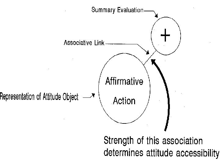 Accessibility Theory • According to Fazio’s model, all the information about a specific subject is contained in one node. • The summary evaluation (i. e. , attitude +/-) about the subject is contained in another node, connected to the subject node. • The strength of the association between the subject node and the summary evaluation node determines attitude accessibility.