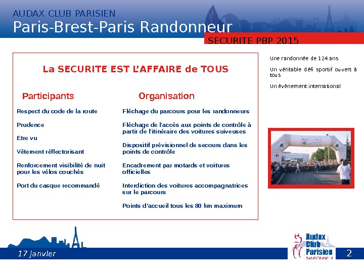 SECURITE PBP 2015 Gilet de haute visibilité offert en 2015 Une randonnée de 124 ans Un véritable défi sportif ouvert à tous Un évènement international 2 417 janvier 2015 AUDAX CLUB PARISIEN Paris-Brest-Paris Randonneur
