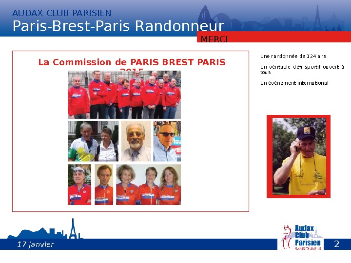 MERCI La Commission de PARIS BREST PARIS 2015 Une randonnée de 124 ans Un véritable défi sportif ouvert à tous Un évènement international 2 817 janvier 2015 AUDAX CLUB PARISIEN Paris-Brest-Paris Randonneur