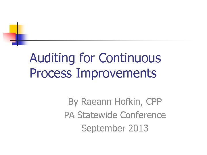 Auditing for Continuous Process Improvements By Raeann Hofkin, CPP PA Statewide Conference September 2013
