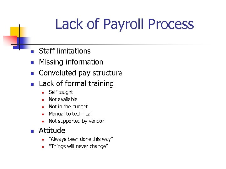 Lack of Payroll Process n n Staff limitations Missing information Convoluted pay structure Lack of formal training n n n Self taught Not available Not in the budget Manual to technical Not supported by vendor Attitude n n “Always been done this way” “Things will never change”