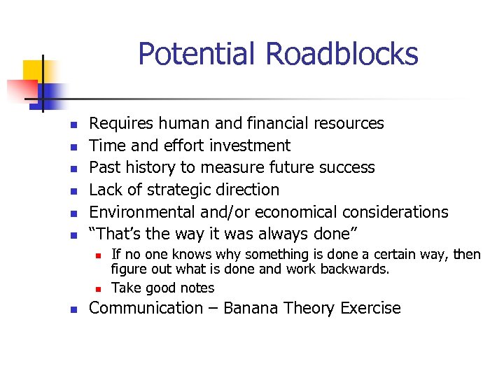 Potential Roadblocks n n n Requires human and financial resources Time and effort investment Past history to measure future success Lack of strategic direction Environmental and/or economical considerations “That’s the way it was always done” n n n If no one knows why something is done a certain way, then figure out what is done and work backwards. Take good notes Communication – Banana Theory Exercise