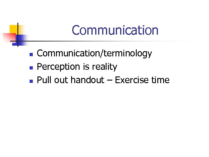 Communication n Communication/terminology Perception is reality Pull out handout – Exercise time