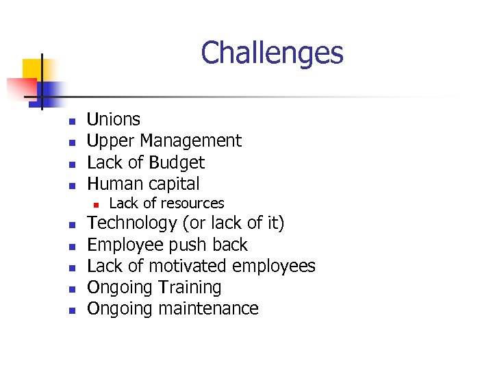 Challenges n n Unions Upper Management Lack of Budget Human capital n n n Lack of resources Technology (or lack of it) Employee push back Lack of motivated employees Ongoing Training Ongoing maintenance