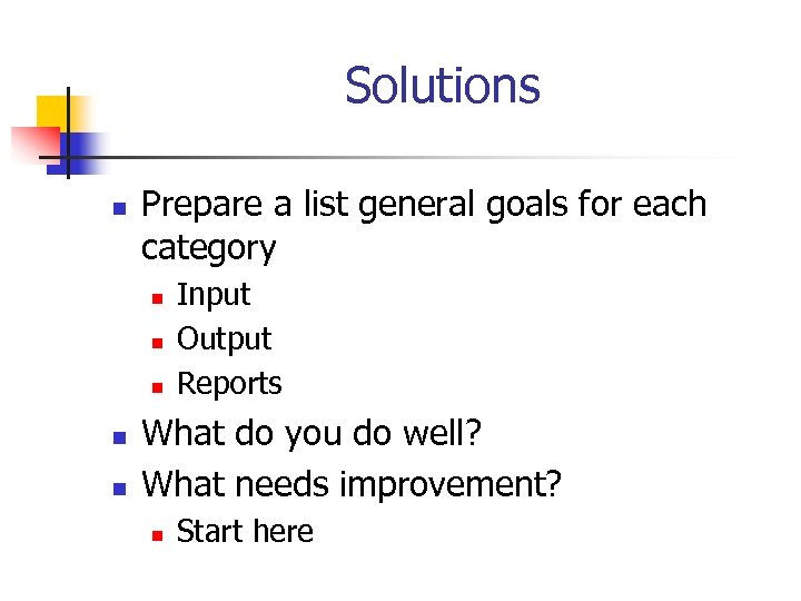 Solutions n Prepare a list general goals for each category n n n Input Output Reports What do you do well? What needs improvement? n Start here