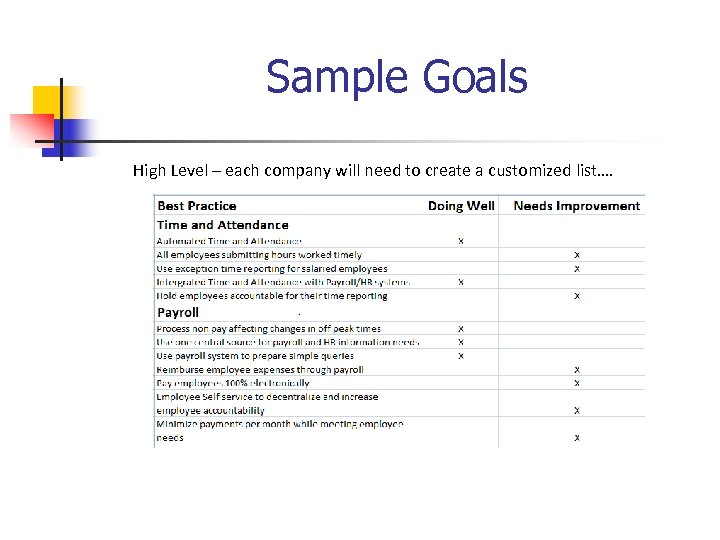 Sample Goals High Level – each company will need to create a customized list….