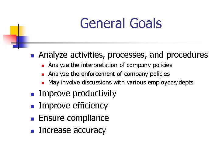 General Goals n Analyze activities, processes, and procedures n n n n Analyze the interpretation of company policies Analyze the enforcement of company policies May involve discussions with various employees/depts. Improve productivity Improve efficiency Ensure compliance Increase accuracy