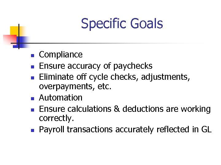 Specific Goals n n n Compliance Ensure accuracy of paychecks Eliminate off cycle checks, adjustments, overpayments, etc. Automation Ensure calculations & deductions are working correctly. Payroll transactions accurately reflected in GL