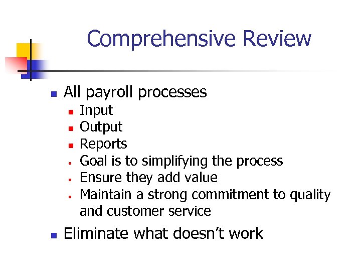 Comprehensive Review n All payroll processes n n n • • • n Input Output Reports Goal is to simplifying the process Ensure they add value Maintain a strong commitment to quality and customer service Eliminate what doesn’t work