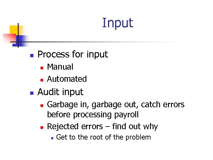 Input n Process for input n n n Manual Automated Audit input n n Garbage in, garbage out, catch errors before processing payroll Rejected errors – find out why n Get to the root of the problem