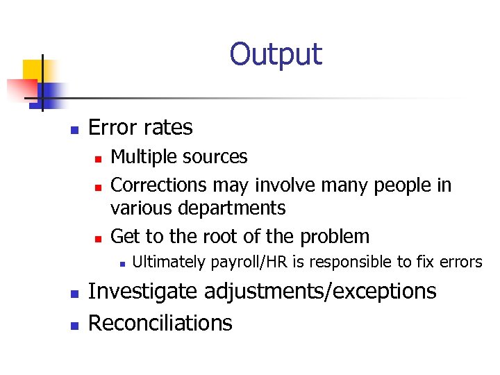 Output n Error rates n n n Multiple sources Corrections may involve many people in various departments Get to the root of the problem n n n Ultimately payroll/HR is responsible to fix errors Investigate adjustments/exceptions Reconciliations