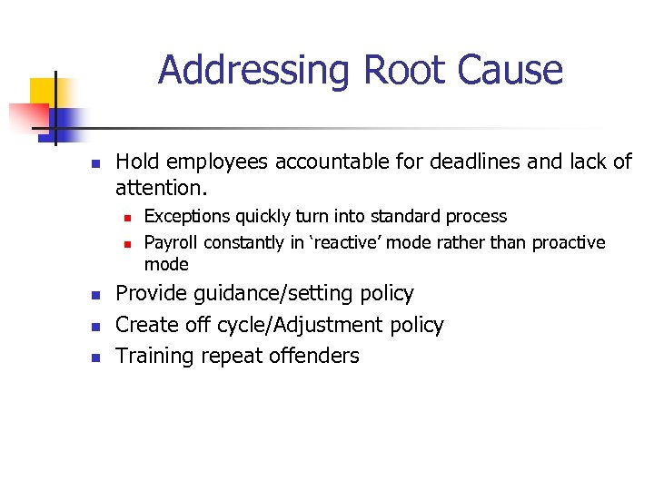 Addressing Root Cause n Hold employees accountable for deadlines and lack of attention. n n n Exceptions quickly turn into standard process Payroll constantly in ‘reactive’ mode rather than proactive mode Provide guidance/setting policy Create off cycle/Adjustment policy Training repeat offenders