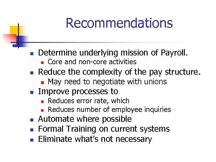 Recommendations n Determine underlying mission of Payroll. n n Reduce the complexity of the pay structure. n n n May need to negotiate with unions Improve processes to n n Core and non-core activities Reduces error rate, which Reduces number of employee inquiries Automate where possible Formal Training on current systems Eliminate what’s not necessary