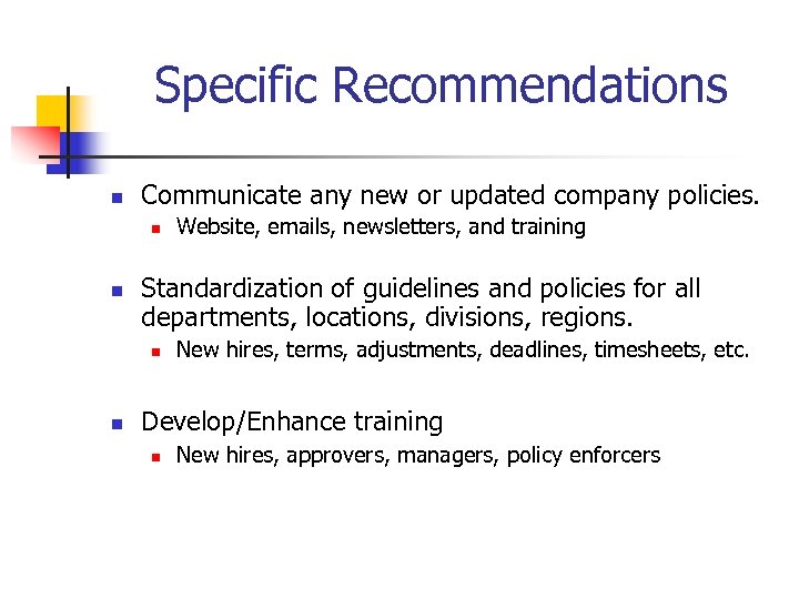 Specific Recommendations n Communicate any new or updated company policies. n n Standardization of guidelines and policies for all departments, locations, divisions, regions. n n Website, emails, newsletters, and training New hires, terms, adjustments, deadlines, timesheets, etc. Develop/Enhance training n New hires, approvers, managers, policy enforcers