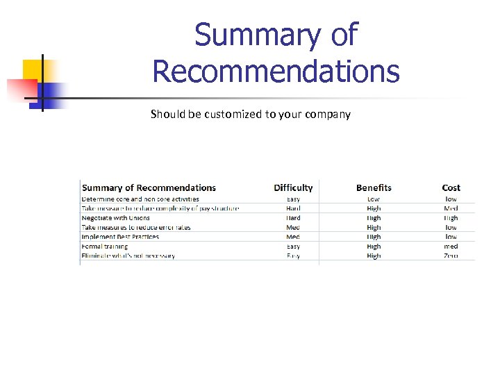 Summary of Recommendations Should be customized to your company