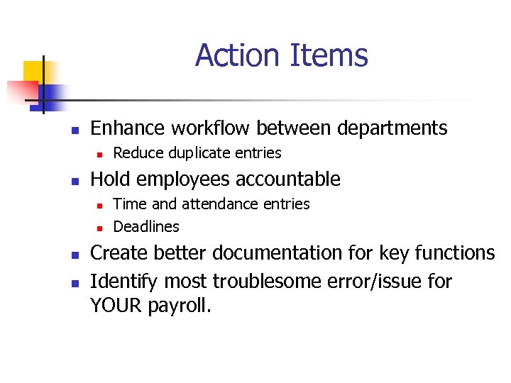 Action Items n Enhance workflow between departments n n Hold employees accountable n n Reduce duplicate entries Time and attendance entries Deadlines Create better documentation for key functions Identify most troublesome error/issue for YOUR payroll.