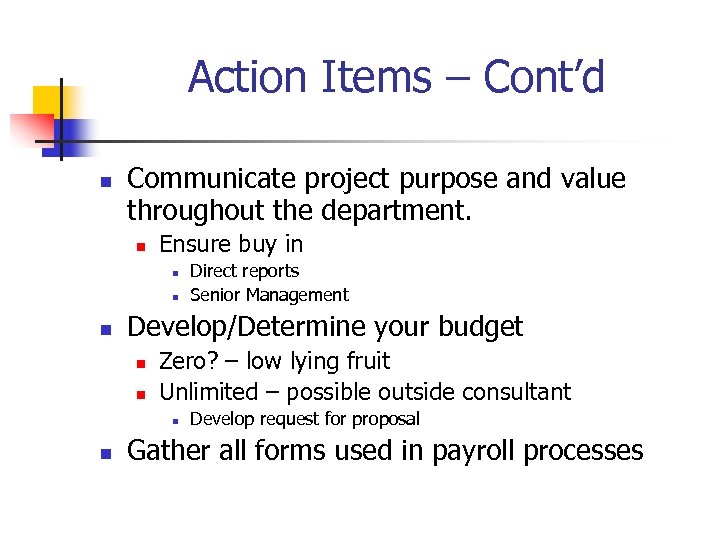 Action Items – Cont’d n Communicate project purpose and value throughout the department. n Ensure buy in n Develop/Determine your budget n n Zero? – low lying fruit Unlimited – possible outside consultant n n Direct reports Senior Management Develop request for proposal Gather all forms used in payroll processes