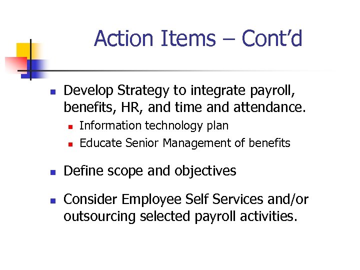 Action Items – Cont’d n Develop Strategy to integrate payroll, benefits, HR, and time and attendance. n n Information technology plan Educate Senior Management of benefits Define scope and objectives Consider Employee Self Services and/or outsourcing selected payroll activities.